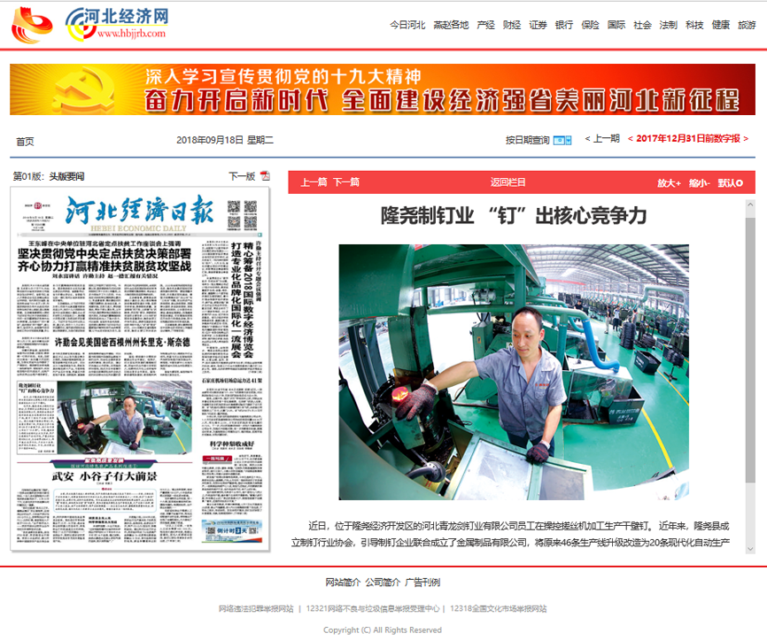 點(diǎn)贊!青龍劍釘業(yè)被《河北經(jīng)濟(jì)日?qǐng)?bào)》頭版要聞