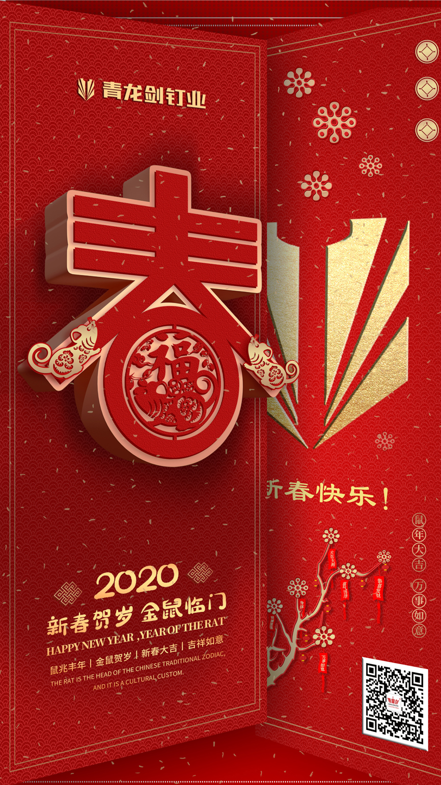 歲序常易,華章日新。當(dāng)時(shí)光穿越年輪,邁向2020新春佳節(jié),中華大地因納其盛世靈氣而芳澤毓秀,在這個(gè)充滿激情與期望的時(shí)刻,青龍劍釘業(yè)全體人員向所有關(guān)心關(guān)愛青龍劍公司發(fā)展的社會(huì)各界同仁、全國(guó)的經(jīng)銷商和用戶朋友們致以親切的節(jié)日問候和誠(chéng)摯的新春祝福!