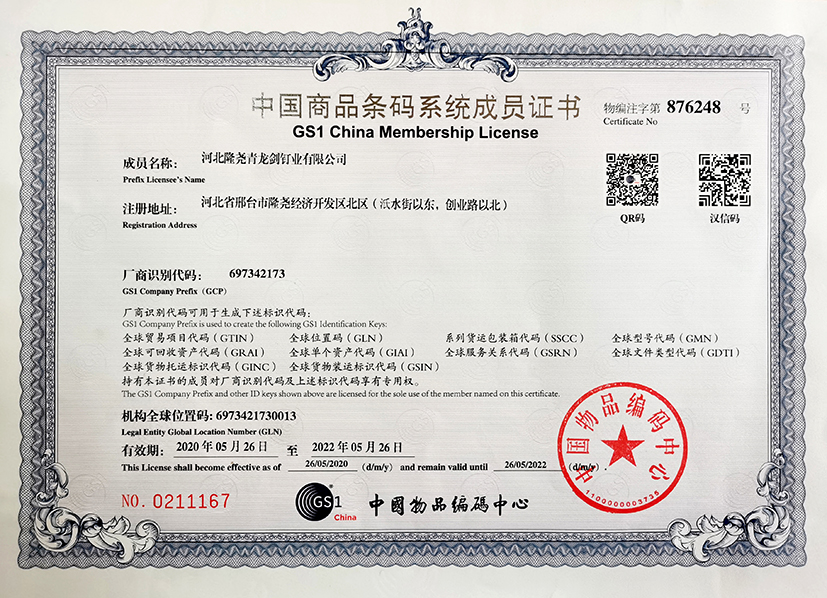 青龍劍釘業(yè)有限公司已成為中國商品條碼系統(tǒng)成員,從2021年起青龍劍全系產(chǎn)品編入中國物品條碼系統(tǒng)。自此青龍劍產(chǎn)品實現(xiàn)了進商超、建材自選賣場、智能分揀倉庫等標(biāo)準(zhǔn)化便捷掃碼進出庫功能。