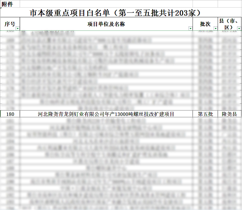 日前,邢臺市生態(tài)環(huán)境局網(wǎng)站公布了《邢臺市本級重點項目白名單企業(yè)》,青龍劍釘業(yè)作為“重點優(yōu)質(zhì)制造業(yè)”,《河北省重點產(chǎn)業(yè)鏈供應鏈企業(yè)白名單》入選、22年動態(tài)調(diào)整列入《邢臺市生態(tài)環(huán)境監(jiān)管白名單企業(yè)》后,2023年第三次動態(tài)調(diào)整再次上榜!