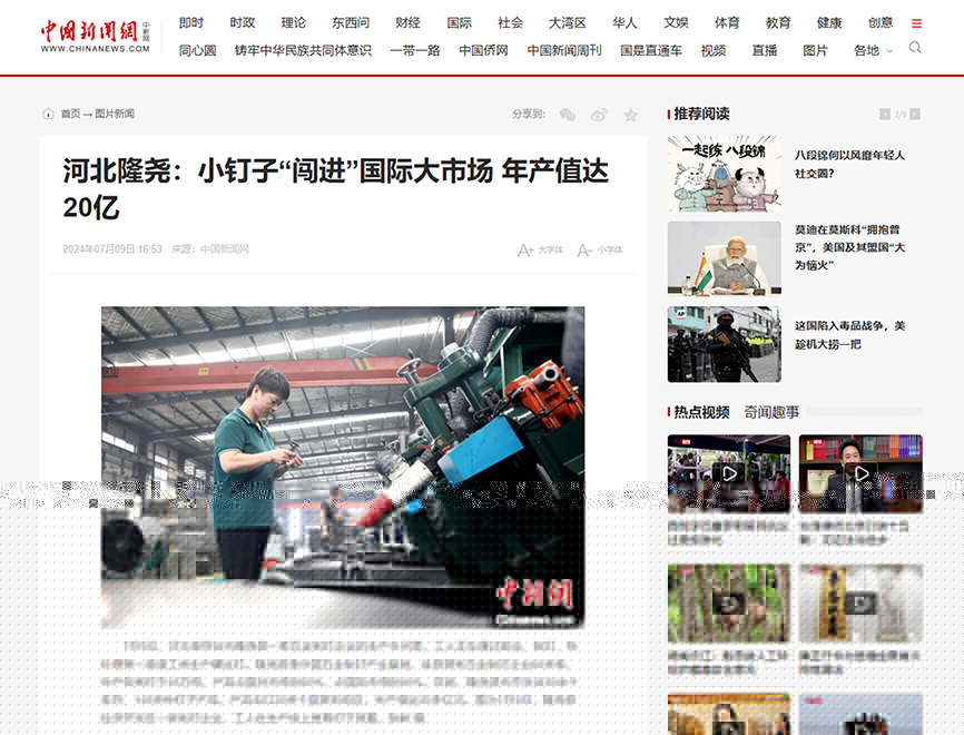 近日,中國新聞網(wǎng)記者走進(jìn)河北隆堯青龍劍釘業(yè)有限公司,對(duì)制釘車間的生產(chǎn)工序及車間環(huán)境進(jìn)行了解和拍攝。7月9日下午,青龍劍釘業(yè)榮登中國新聞網(wǎng)。