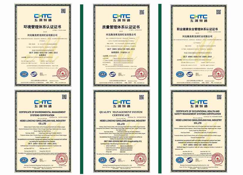 公司始終以“讓勞動創(chuàng)造更多價值”為企業(yè)理念,致力于生產(chǎn)優(yōu)質(zhì)高效的釘類產(chǎn)品。本次通過科學(xué)的管理體系和方法,不斷提升產(chǎn)品質(zhì)量與服務(wù)水平。此次公司通過了多項體系認(rèn)證,標(biāo)志著青龍劍公司一直保持符合國際標(biāo)準(zhǔn)化的管理體系要求,進一步鞏固了青龍劍在行業(yè)中的領(lǐng)先地位。