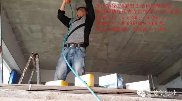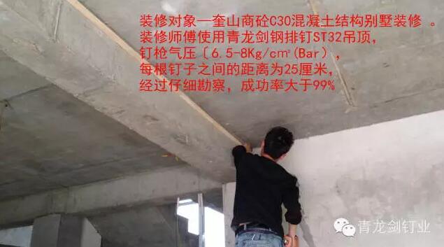 裝修工程隊(duì)使用青龍劍鋼排釘ST32對(duì)使用奎山商砼C30混凝土結(jié)構(gòu)的別墅進(jìn)行裝修吊頂 。(C30等級(jí)的混凝土幾乎可以適用于所有工業(yè)與民用建筑物、構(gòu)筑物的各種構(gòu)件)。
