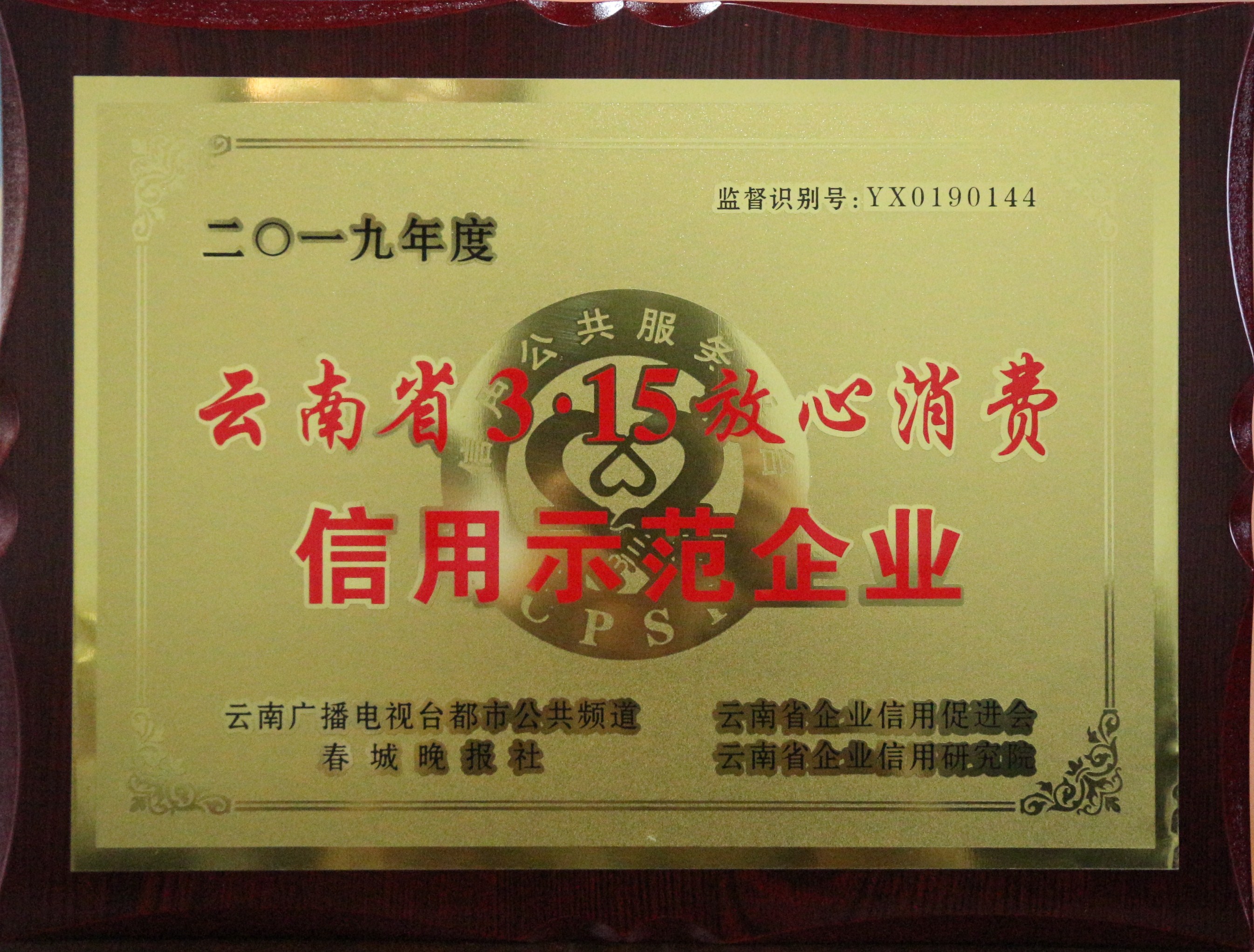 2019年度云南省3.15放心消費信用示范企業(yè)