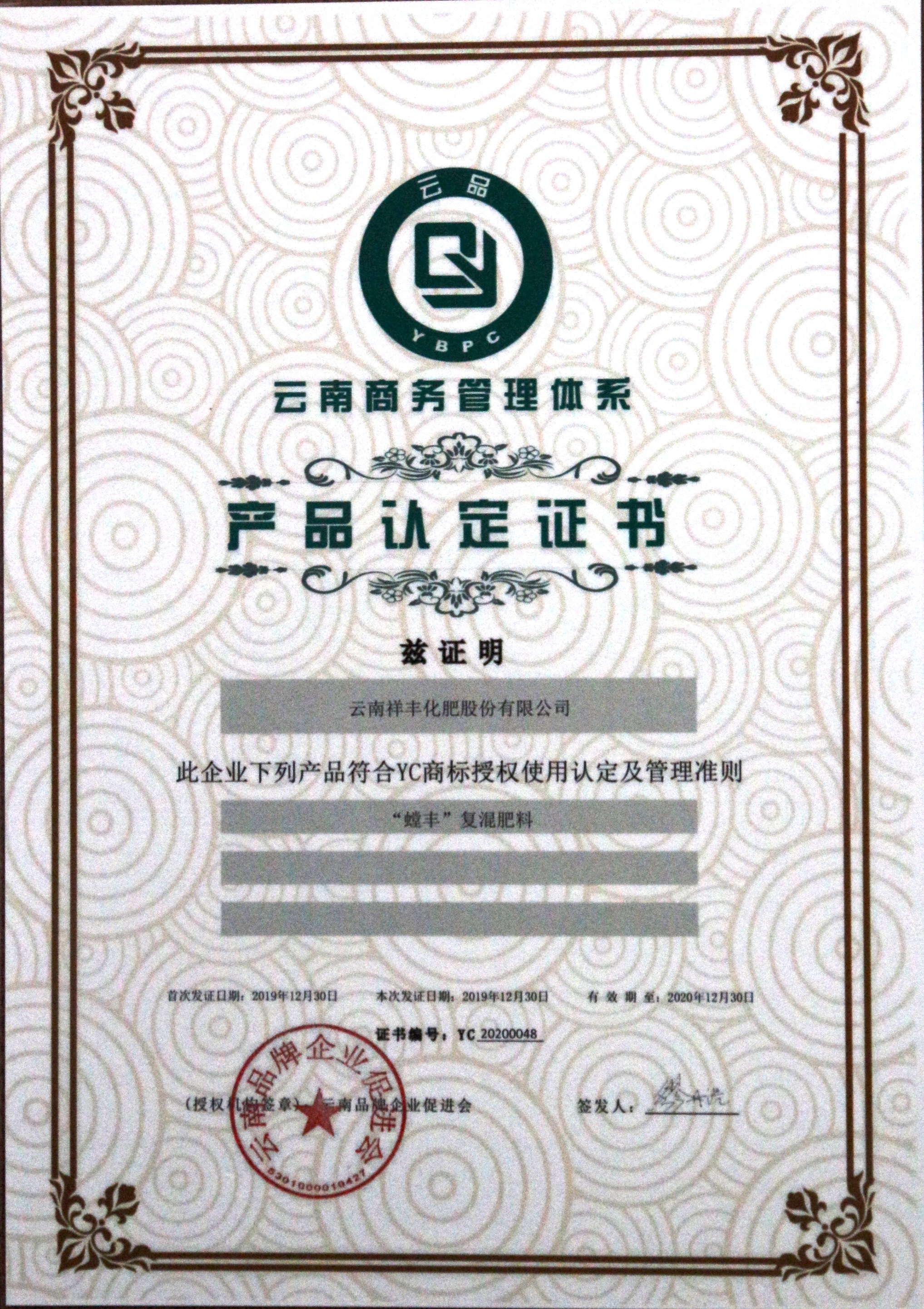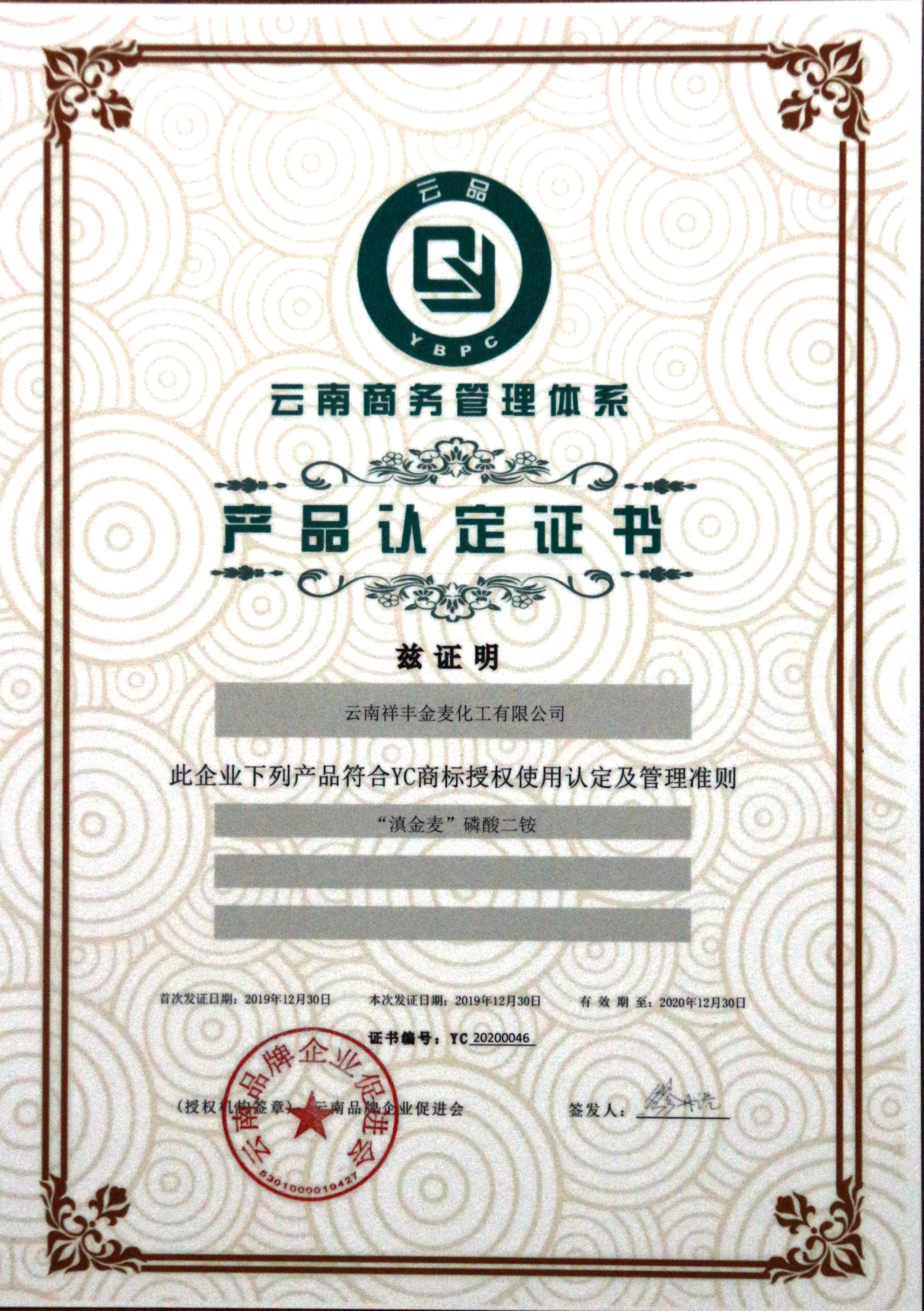 祥豐金麥“滇金麥”磷酸二銨符合YC商標授權(quán)使用認定及管理準則