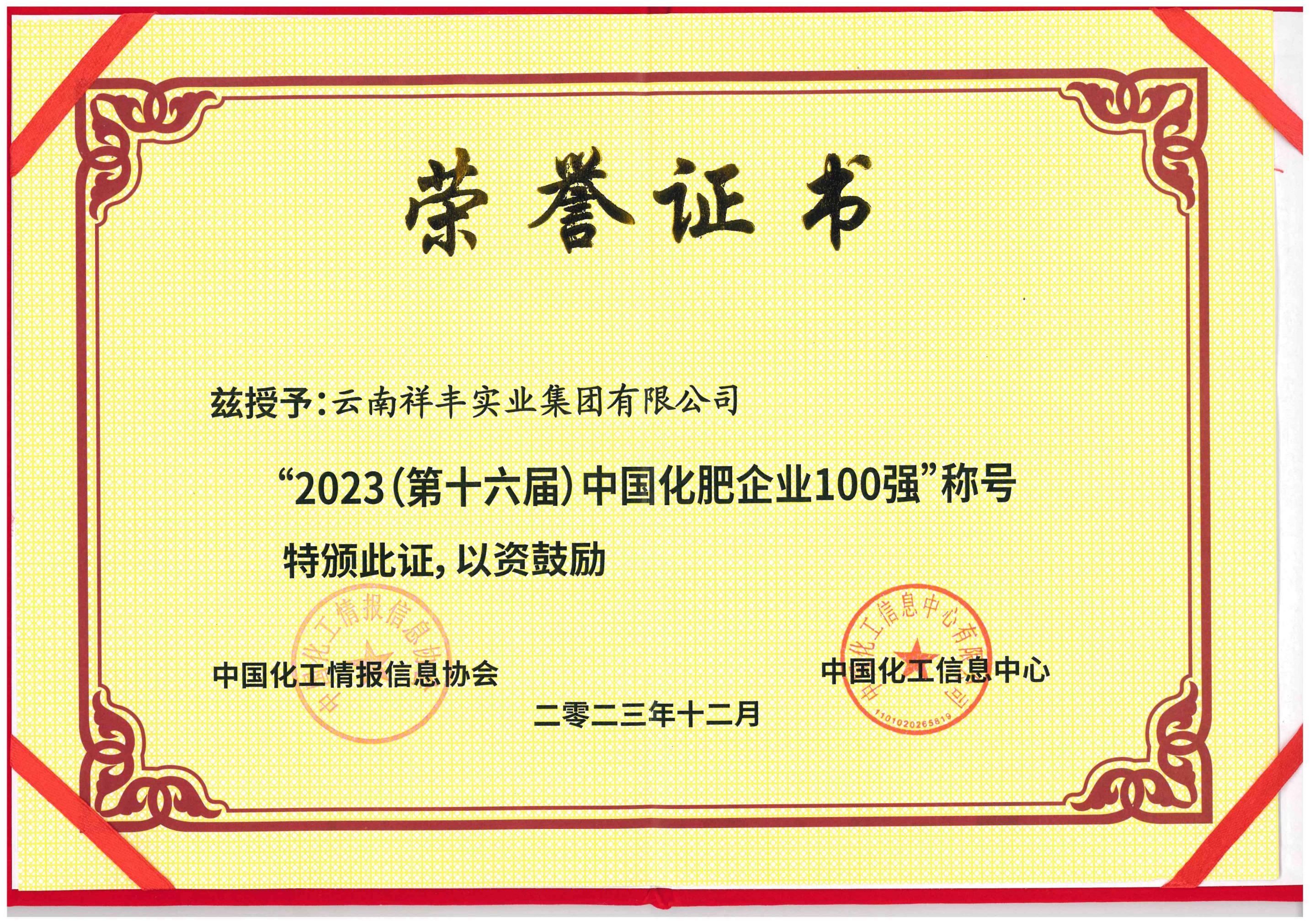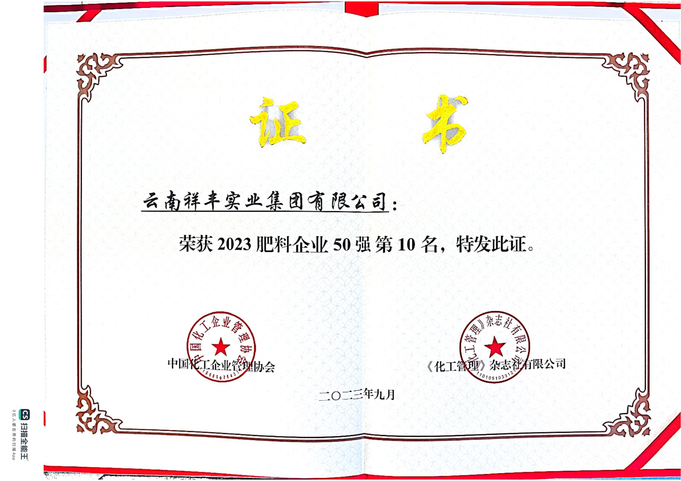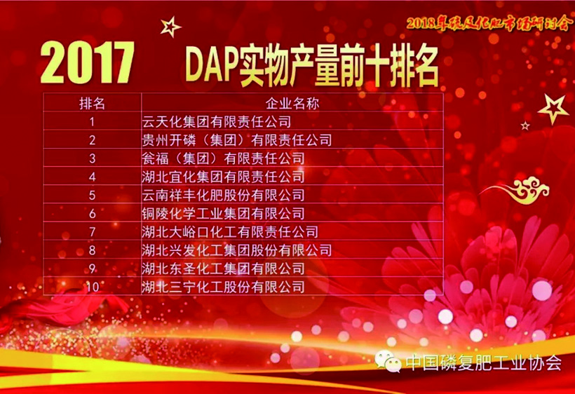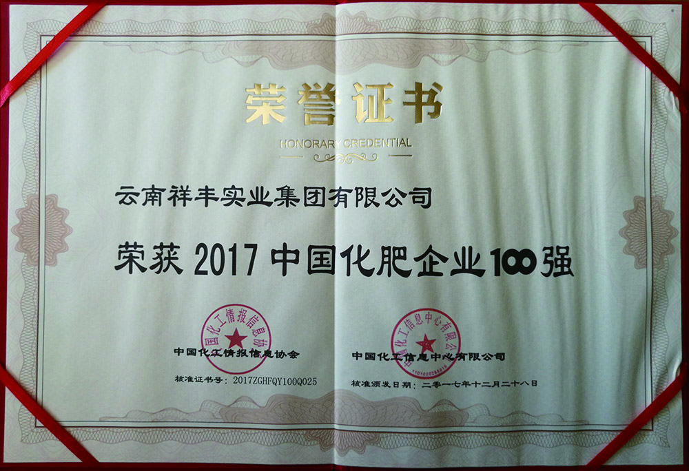 2018年12月16日,2018(第十一屆)中國化肥企業(yè)100強(qiáng)發(fā)布會(huì)暨國家化肥品牌計(jì)劃高峰論壇在山東青島舉行。云南祥豐集團(tuán)位列中國磷復(fù)肥企業(yè)100強(qiáng)第十名,中國化肥企業(yè)100強(qiáng)第十九名